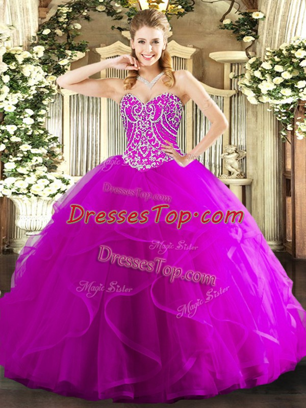 Custom Design Sweetheart Sleeveless Lace Up Quince Ball Gowns Fuchsia Tulle