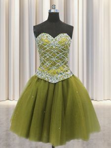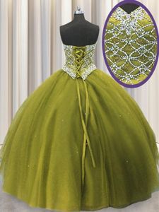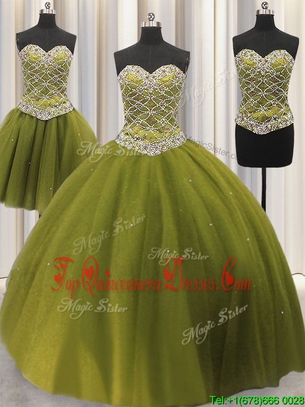 Custom Design Three Piece Olive Green Ball Gowns Sweetheart Sleeveless Tulle Floor Length Lace Up Beading and Sequins Quinceanera Dresses