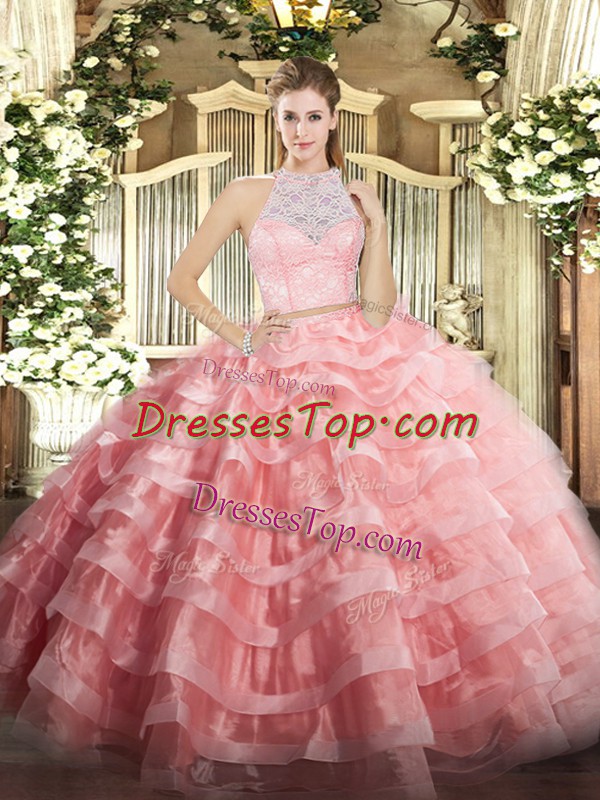 Custom Design Watermelon Red Scoop Zipper Lace and Ruffled Layers Sweet 16 Quinceanera Dress Sleeveless