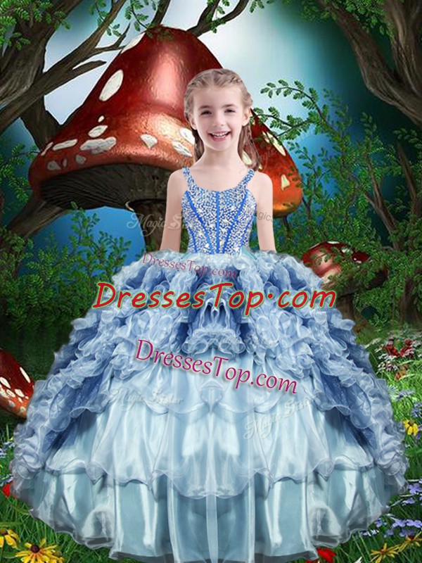 Custom Designed Baby Blue Ball Gowns Straps Sleeveless Organza Floor Length Lace Up Beading and Ruffles and Ruffled Layers Little Girl Pageant Gowns