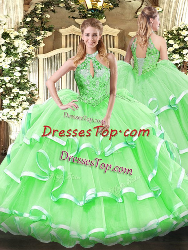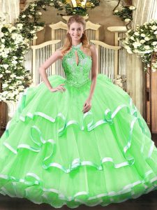 Custom Designed Ball Gowns Organza Halter Top Sleeveless Beading and Ruffles Floor Length Lace Up Quinceanera Gowns