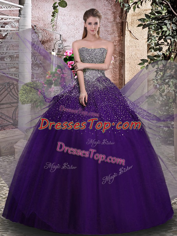 Custom Designed Ball Gowns Quince Ball Gowns Purple Strapless Tulle Sleeveless Floor Length Lace Up