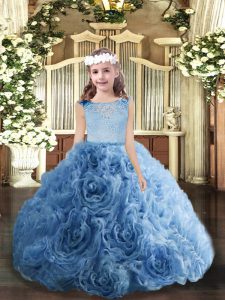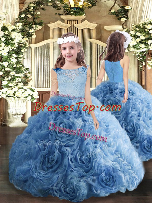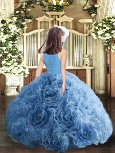 Custom Designed Blue Fabric With Rolling Flowers Zipper Bateau Sleeveless Floor Length Pageant Dress Toddler Beading
