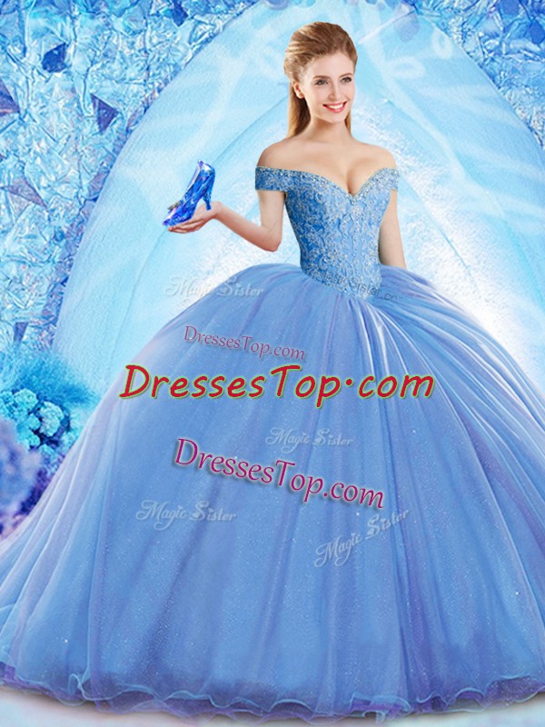 Custom Designed Blue Sleeveless Brush Train Beading Quinceanera Dresses