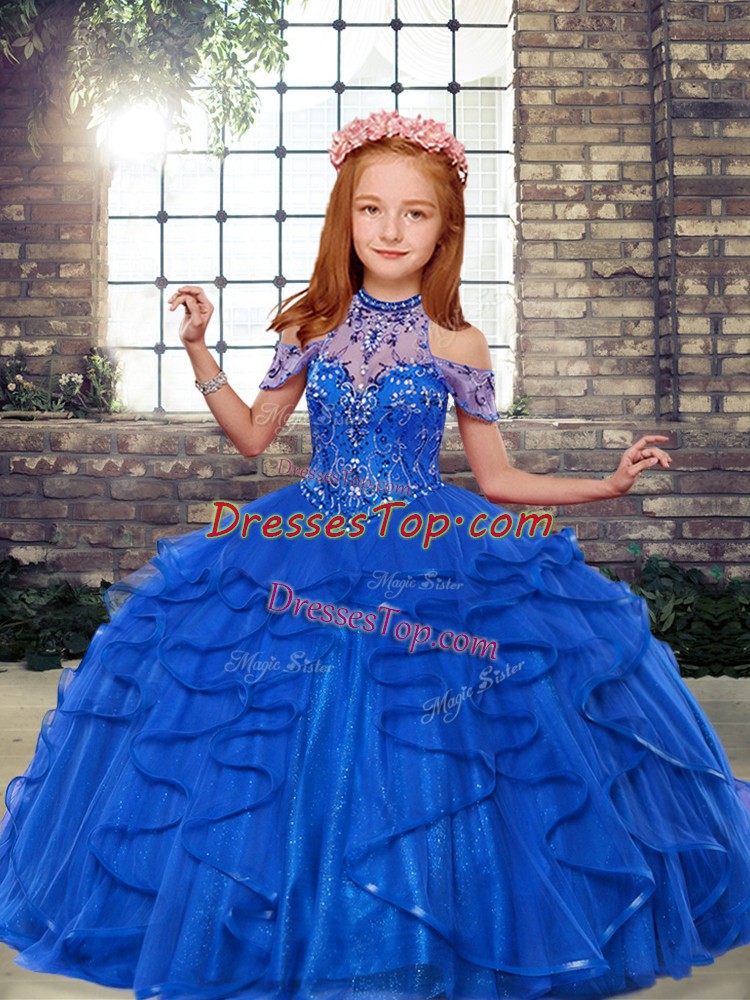 Custom Designed High-neck Sleeveless Tulle Little Girls Pageant Gowns Beading and Ruffles Lace Up
