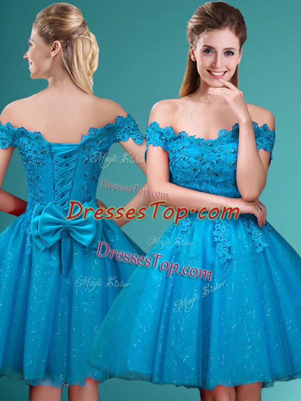 Custom Designed Knee Length Aqua Blue Dama Dress Off The Shoulder Cap Sleeves Lace Up