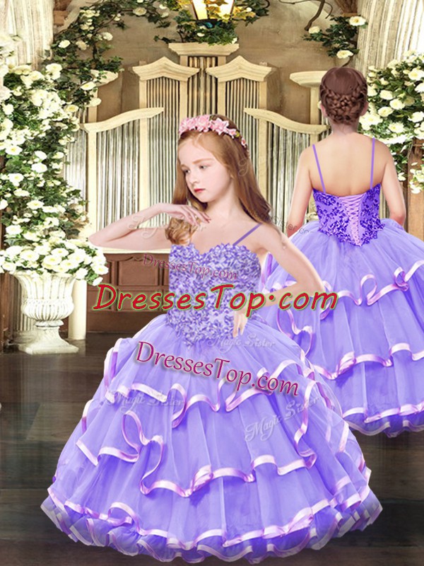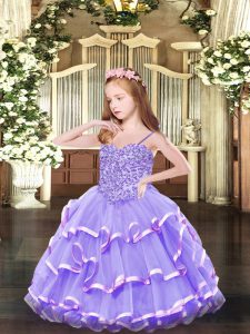 Custom Designed Lavender Ball Gowns Spaghetti Straps Sleeveless Organza Floor Length Lace Up Appliques and Ruffled Layers Little Girls Pageant Dress