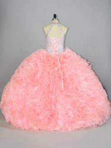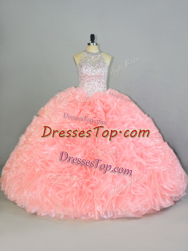 Custom Designed Peach Lace Up Halter Top Beading and Ruffles Quince Ball Gowns Organza Sleeveless