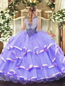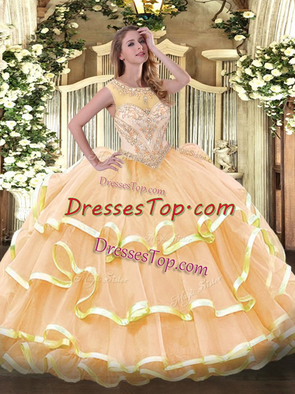 Custom Designed Peach Zipper Scoop Beading and Ruffled Layers Quince Ball Gowns Organza Sleeveless