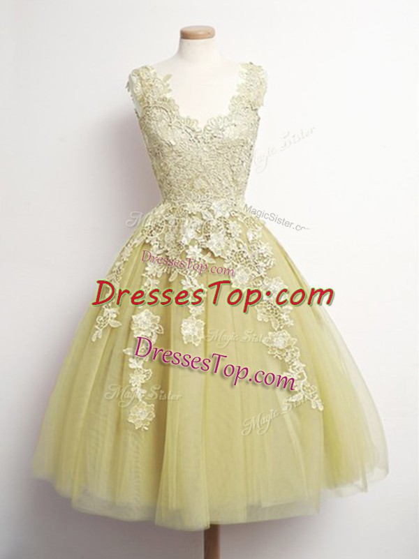 Custom Designed Sleeveless Knee Length Appliques Lace Up Quinceanera Dama Dress with Yellow
