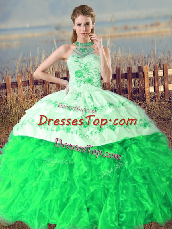 Custom Designed Sleeveless Organza Court Train Lace Up Vestidos de Quinceanera in Green with Embroidery and Ruffles