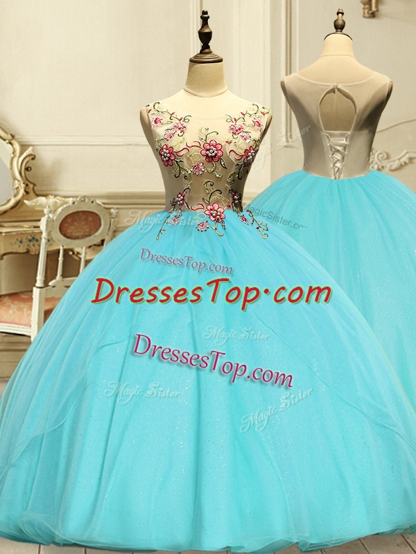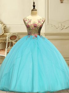 Custom Designed Sleeveless Organza Floor Length Lace Up 15 Quinceanera Dress in Aqua Blue with Appliques