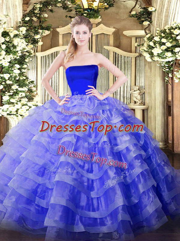 Custom Designed Strapless Sleeveless Quinceanera Gown Floor Length Ruffled Layers Blue Tulle