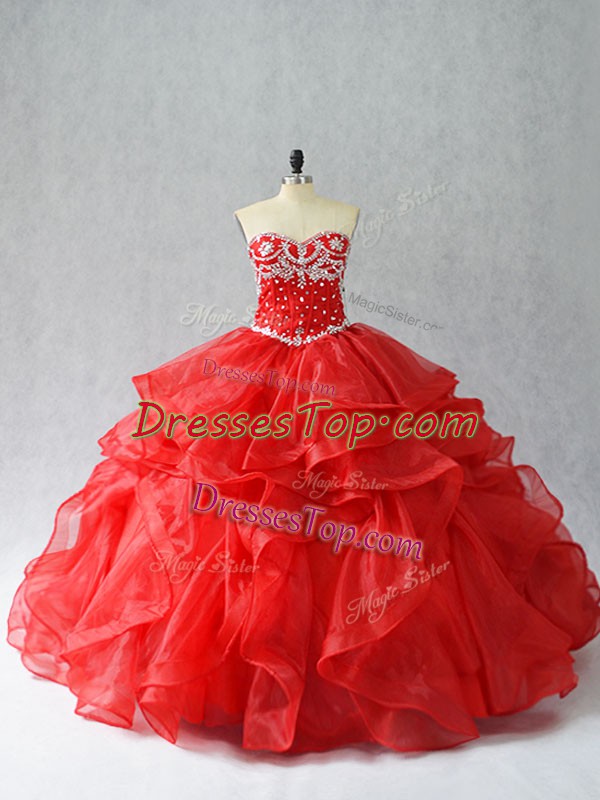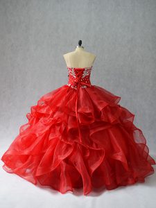 Custom Designed Sweetheart Sleeveless Quinceanera Dress Floor Length Beading and Ruffles Red Organza