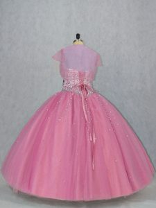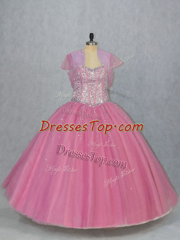 Custom Designed Sweetheart Sleeveless Quinceanera Gowns Floor Length Beading Pink Tulle