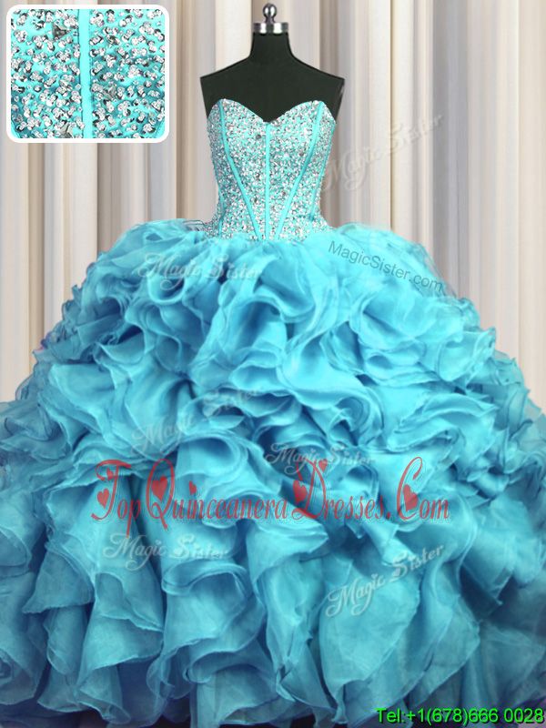 Custom Designed Visible Boning Bling-bling Aqua Blue Sleeveless With Train Beading and Ruffles Lace Up Vestidos de Damas