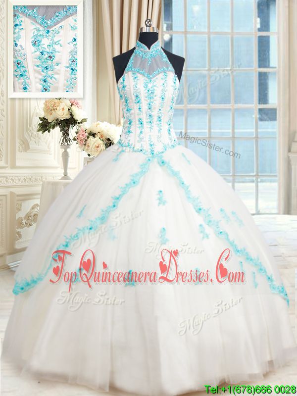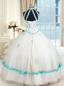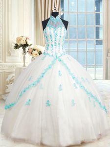 Custom Designed White Ball Gowns Halter Top Sleeveless Tulle Floor Length Lace Up Beading and Appliques Vestidos de Damas