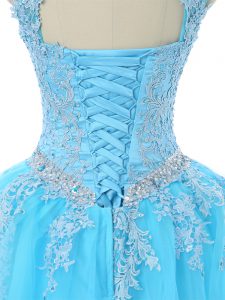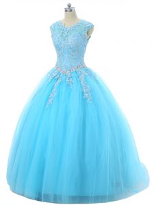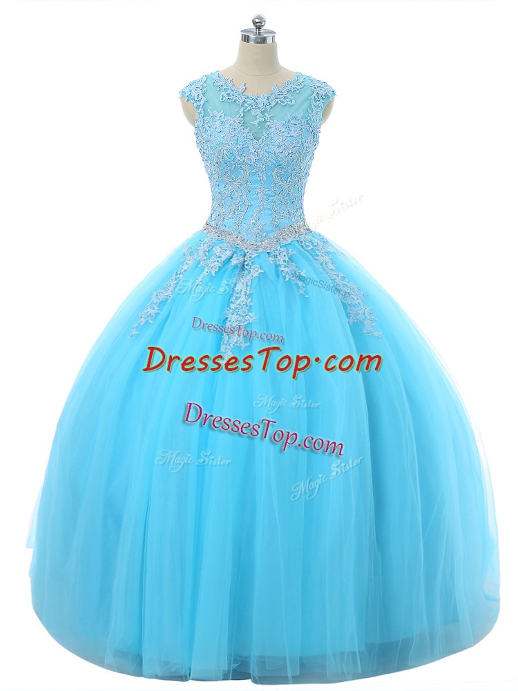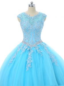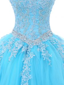 Custom Fit Aqua Blue Ball Gowns Tulle Scoop Sleeveless Appliques Floor Length Lace Up 15 Quinceanera Dress