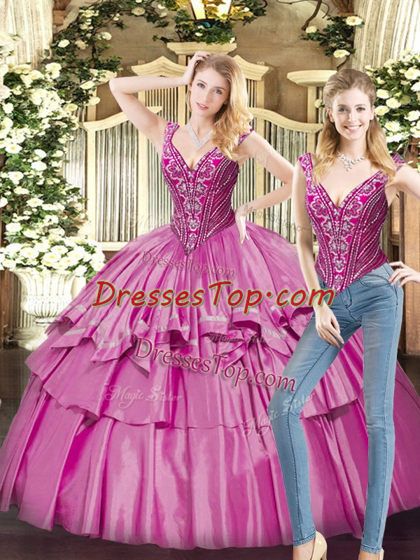 Custom Fit Fuchsia Sleeveless Floor Length Beading and Ruffled Layers Lace Up Sweet 16 Quinceanera Dress