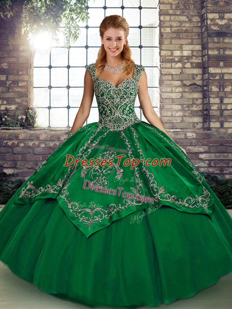 Custom Fit Green Ball Gown Prom Dress Military Ball and Sweet 16 and Quinceanera with Beading and Embroidery Straps Sleeveless Lace Up
