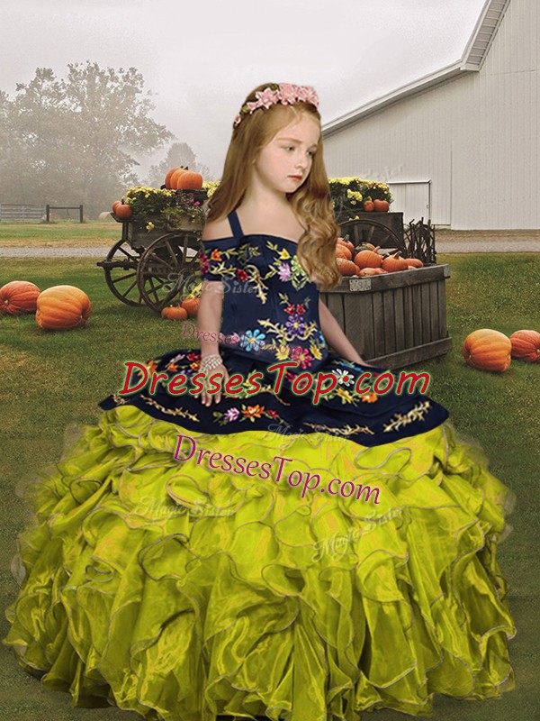Custom Fit Green Organza Lace Up Straps Sleeveless Floor Length Little Girl Pageant Gowns Embroidery and Ruffles