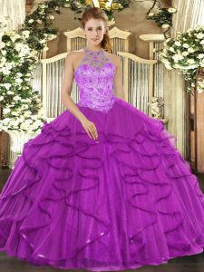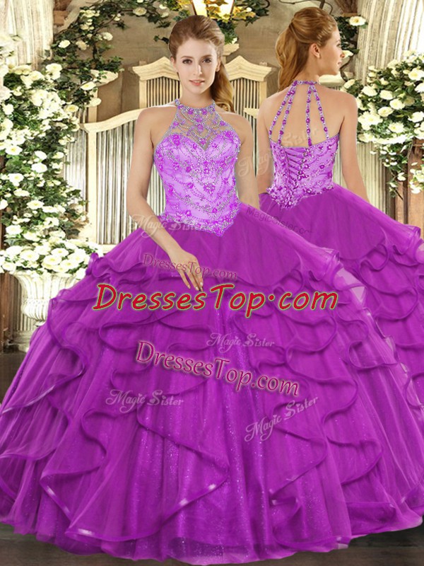 Custom Fit Halter Top Sleeveless Sweet 16 Quinceanera Dress Floor Length Beading and Ruffles Purple Organza