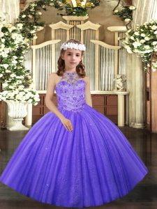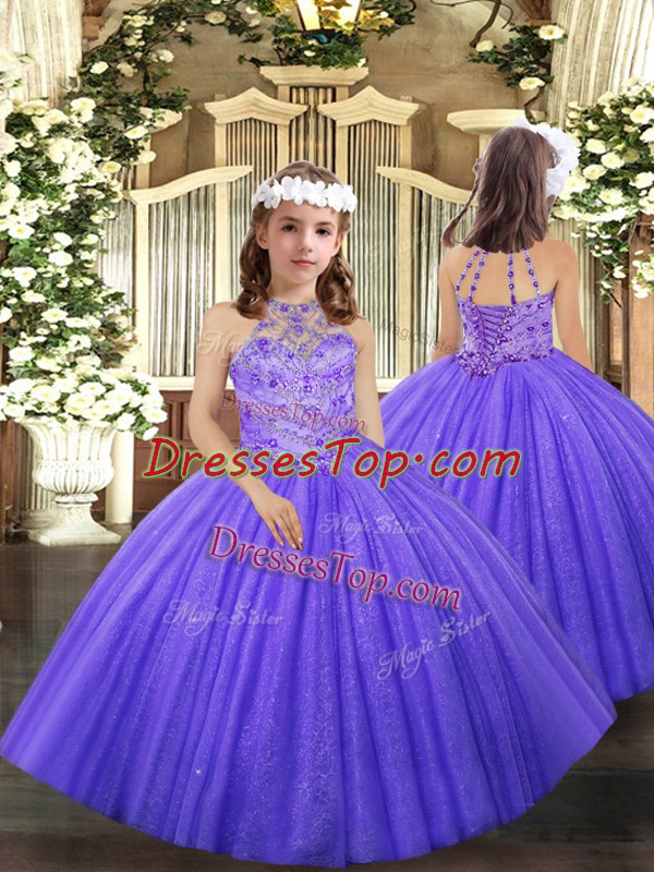 Custom Fit Lavender Tulle Lace Up Halter Top Sleeveless Floor Length Child Pageant Dress Beading and Ruffles