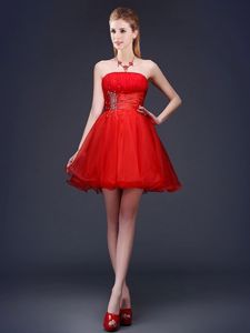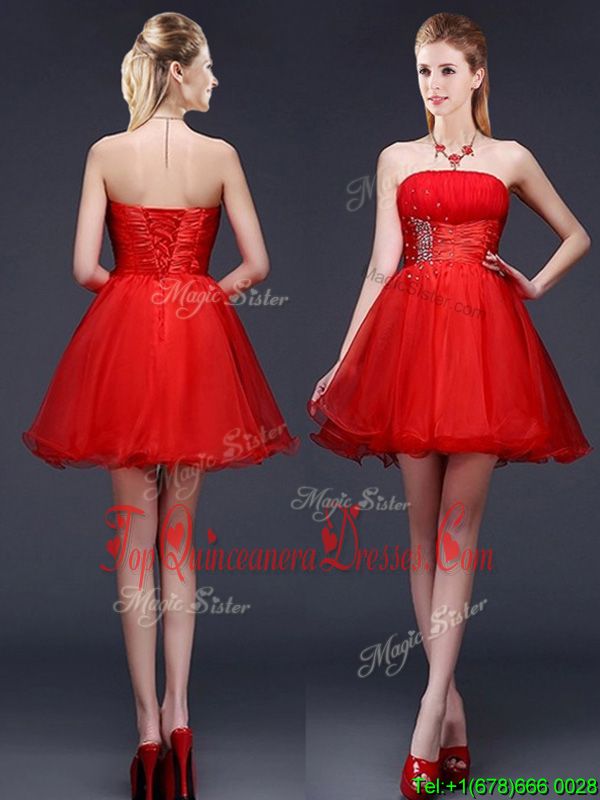 Custom Fit Mini Length Red Dama Dress Organza Sleeveless Beading and Ruching and Belt