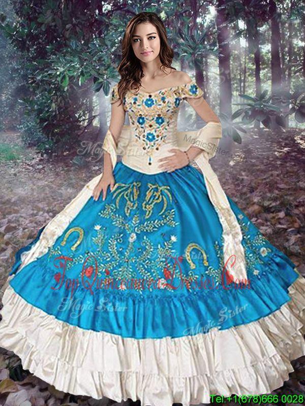 Custom Fit Off the Shoulder Cap Sleeves Taffeta Lace Up Ball Gown Prom Dress in Teal for with Embroidery and Ruffled Layers