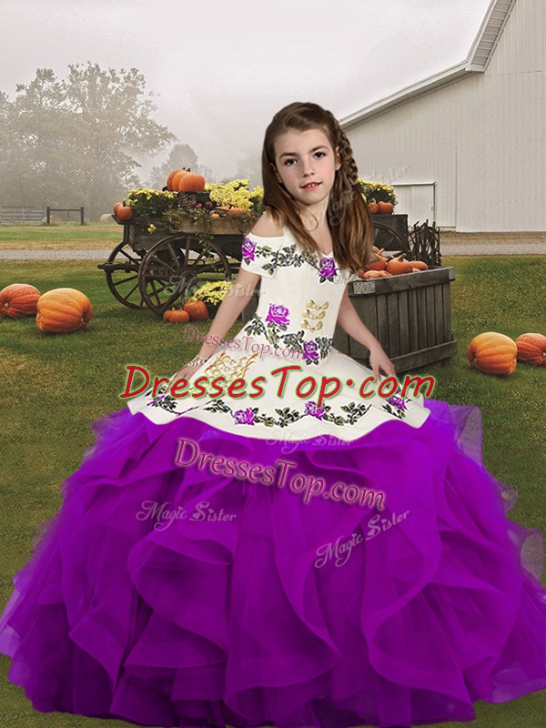 Custom Fit Purple Straps Neckline Embroidery and Ruffles Little Girls Pageant Dress Sleeveless Lace Up