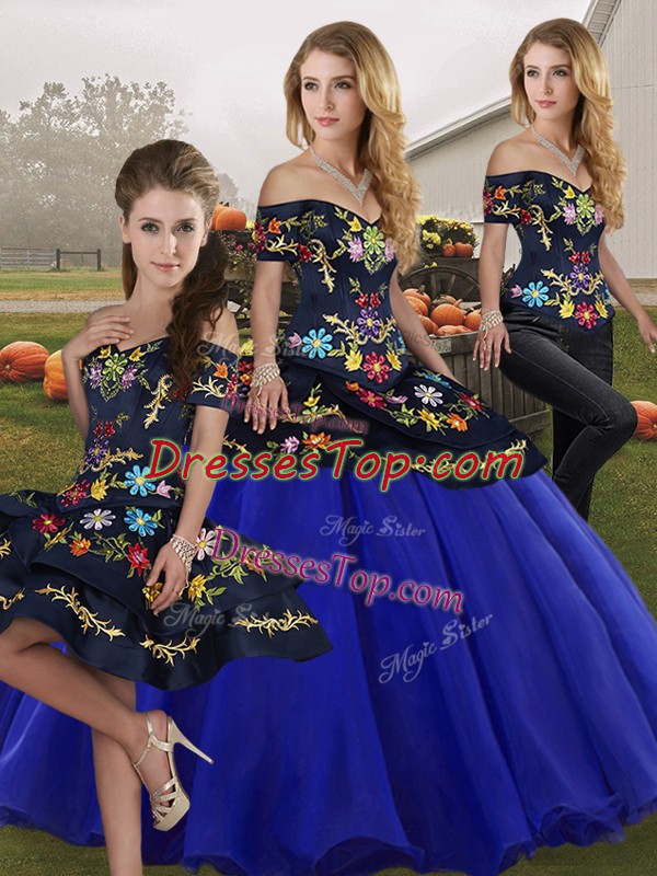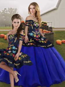 Custom Fit Royal Blue Off The Shoulder Lace Up Embroidery Quinceanera Gowns Sleeveless