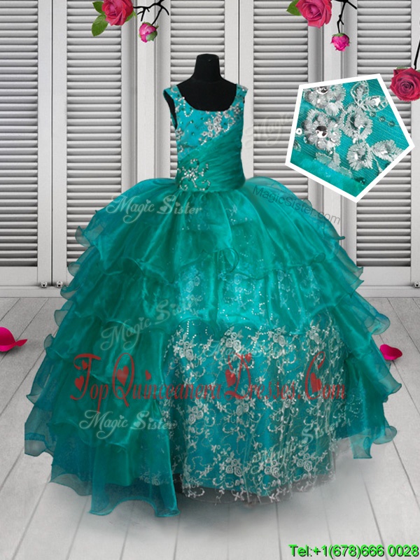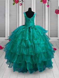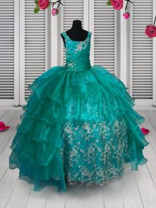 Custom Fit Ruffled Straps Sleeveless Lace Up Pageant Dress for Teens Turquoise Organza