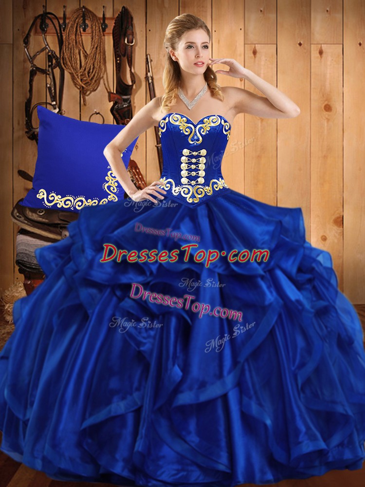 Custom Fit Sweetheart Sleeveless Sweet 16 Dress Floor Length Embroidery and Ruffles Royal Blue Organza