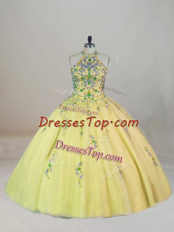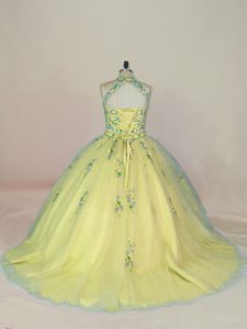 Custom Fit Yellow Halter Top Lace Up Appliques and Embroidery Sweet 16 Quinceanera Dress Brush Train Sleeveless