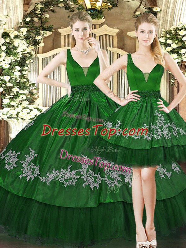 Custom Made Dark Green Ball Gowns Tulle Straps Sleeveless Appliques Floor Length Lace Up Quinceanera Gowns
