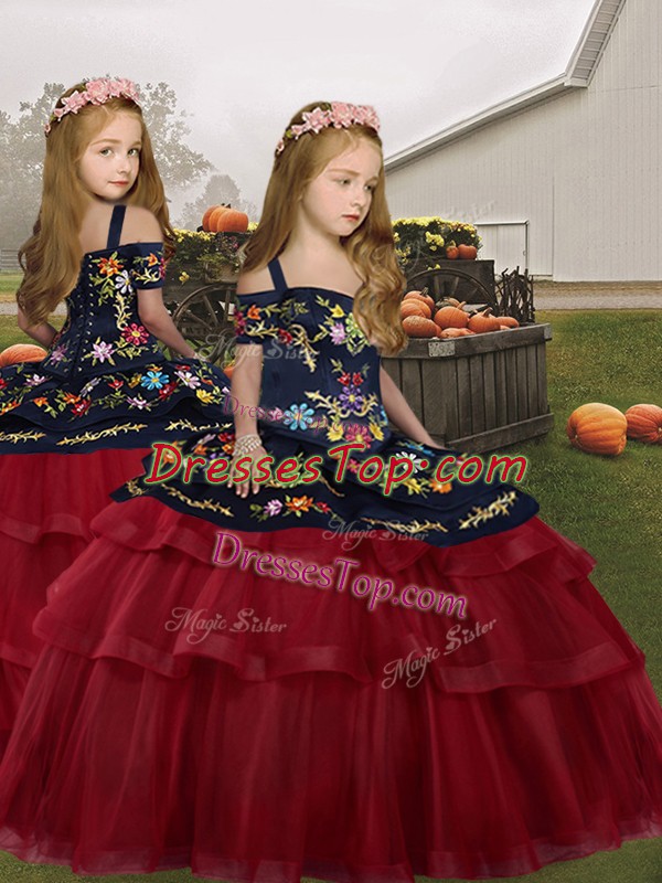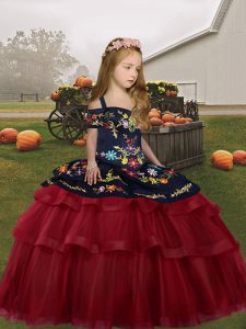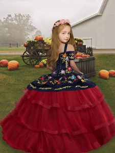 Custom Made Embroidery and Ruffled Layers Little Girl Pageant Gowns Red Lace Up Sleeveless Floor Length