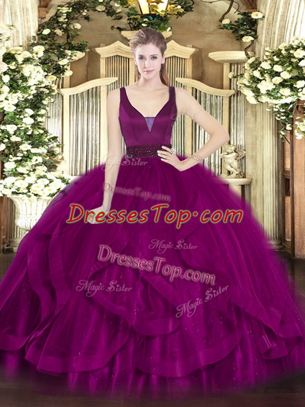 Custom Made Floor Length Zipper 15 Quinceanera Dress Fuchsia for Military Ball and Sweet 16 and Quinceanera with Beading and Ruffles