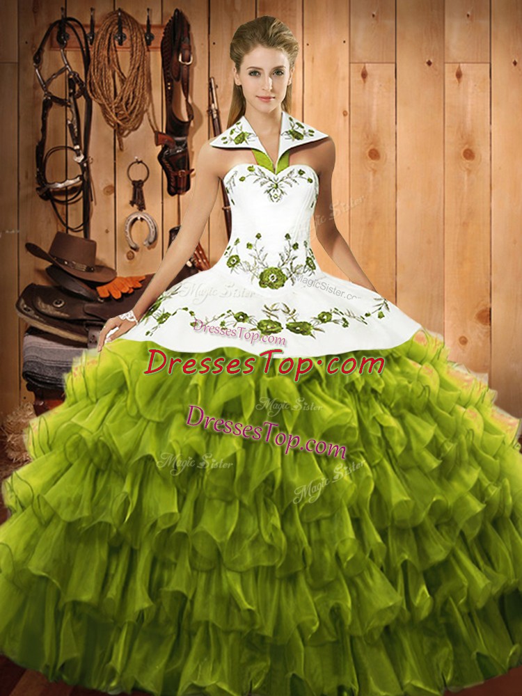 Custom Made Olive Green Ball Gowns Halter Top Sleeveless Organza Floor Length Lace Up Embroidery and Ruffled Layers Quinceanera Dress