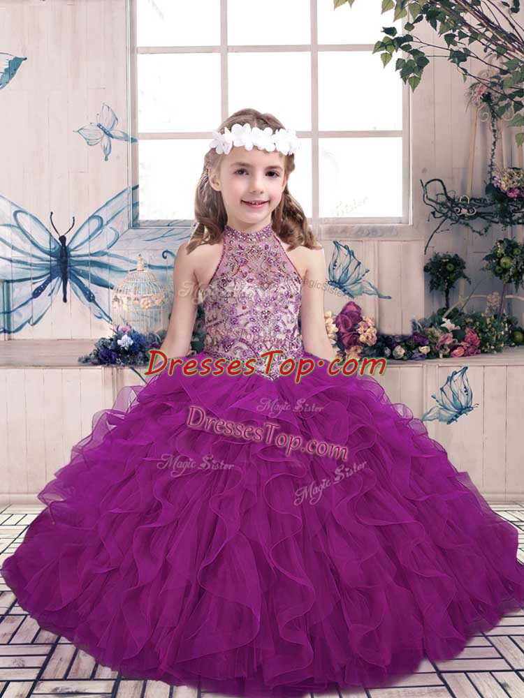Custom Made Purple Ball Gowns Beading and Ruffles Kids Pageant Dress Lace Up Tulle Sleeveless Floor Length