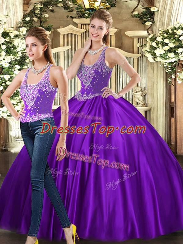 Custom Made Purple Ball Gowns Beading Quince Ball Gowns Lace Up Tulle Sleeveless Floor Length