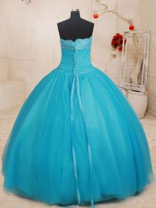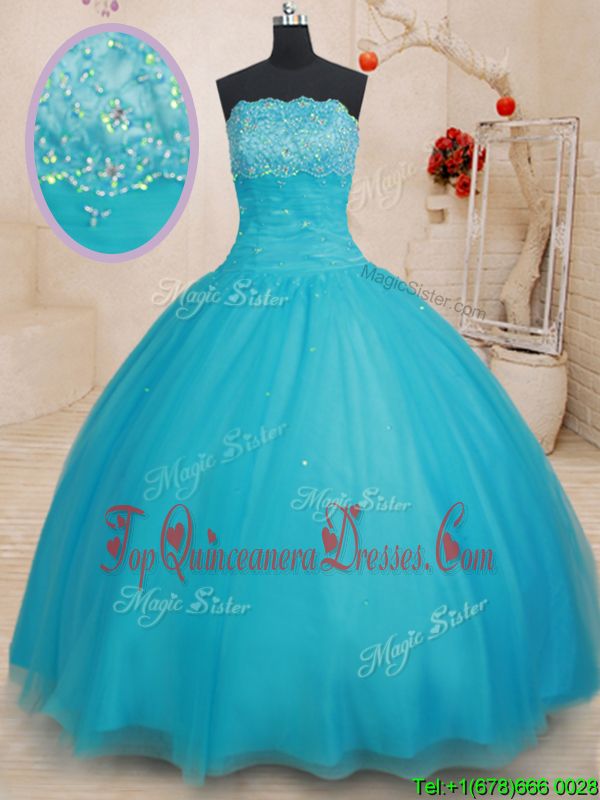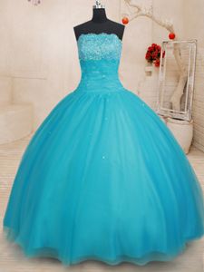 Custom Made Scalloped Aqua Blue Tulle Lace Up Quinceanera Dresses Sleeveless Floor Length Beading