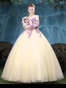 Custom Made Scoop Long Sleeves Tulle Floor Length Lace Up Sweet 16 Dress in Light Yellow for with Appliques
