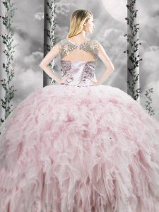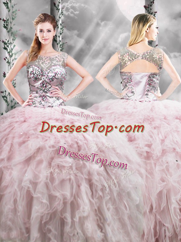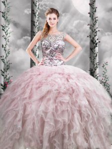 Custom Made Scoop Sleeveless Sweet 16 Quinceanera Dress Floor Length Ruffles Pink Tulle