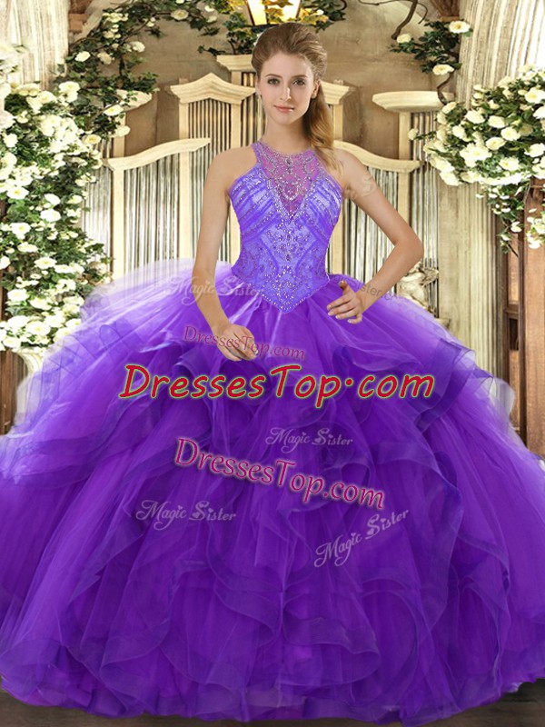 Custom Made Sleeveless Organza Floor Length Lace Up Vestidos de Quinceanera in Purple with Beading and Ruffles