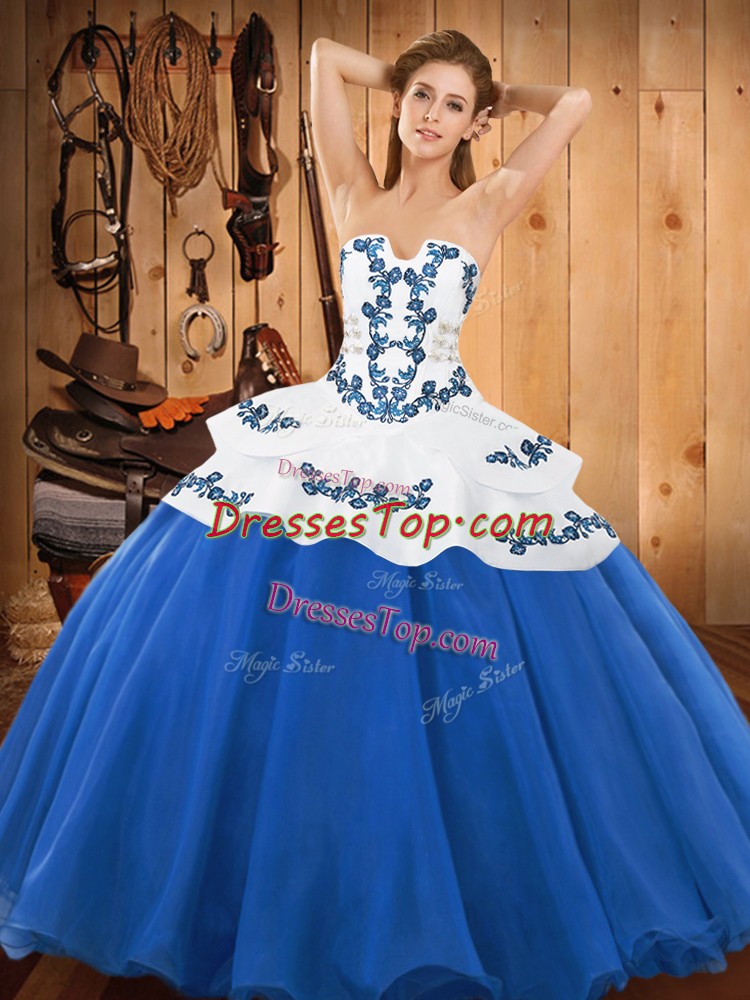 Custom Made Strapless Sleeveless Lace Up Quinceanera Gowns Blue Satin and Organza