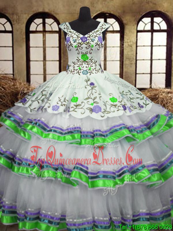 Custom Made White Ball Gowns Straps Sleeveless Organza and Taffeta Floor Length Lace Up Embroidery and Ruffled Layers Sweet 16 Dress