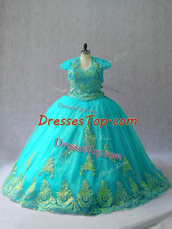 Customized Aqua Blue Tulle Lace Up 15th Birthday Dress Sleeveless Appliques