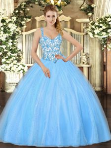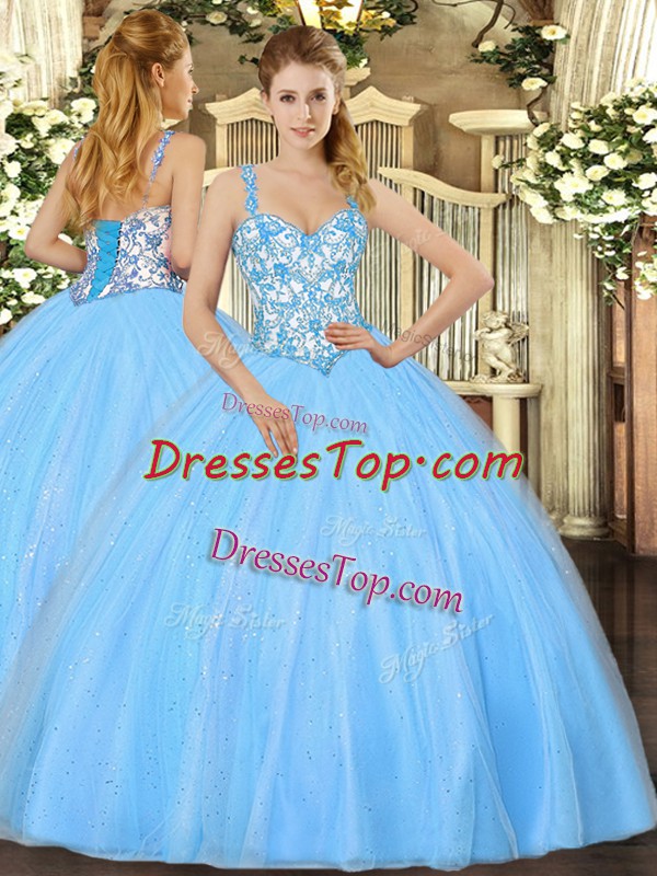 Customized Baby Blue Straps Neckline Beading and Appliques Quince Ball Gowns Sleeveless Lace Up