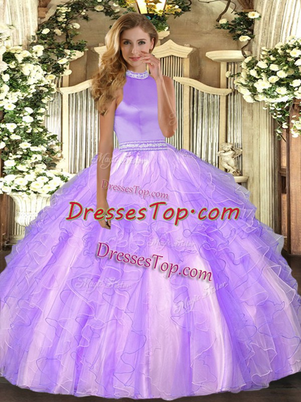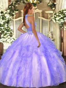 Customized Beading and Ruffles Quince Ball Gowns Lavender Backless Sleeveless Floor Length
