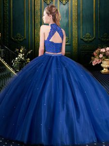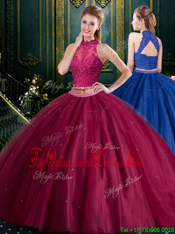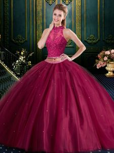Customized Burgundy Two Pieces Tulle Halter Top Sleeveless Appliques Floor Length Lace Up Quinceanera Court of Honor Dress